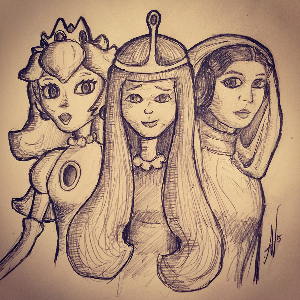 The Princesses of Awesomeness Author Augiewan Date Comments: Leave a comment The Princesses of Awesomeness! Princess Bubblegum, Princess Peach and Princess Leia. I really like the concept of this sketch but it was just a nightly sketch. I want to revisit it as a more polished piece with color soon. Sketch-A-Day 127