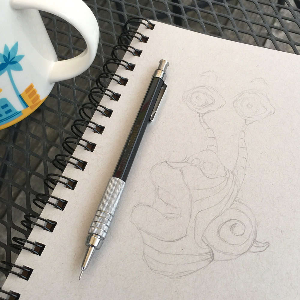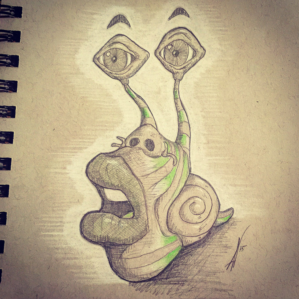 This is Frank. Frank is a snail. Unfortunately there is no sense of scale to this drawing or you would realize that Frank could eat a Cretinian Hufaloom and three Pigmy Elephants for a mid-day snack and still have room for some crumpets. Sketch-A-Day 187