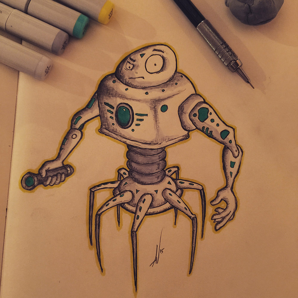 Robot Sketch With a Splash of Copic ColorRobot sketch with a splash of shading and color, via Copic markers! Question: why does a robot need a flashlight? The world may never know… Sketch-A-Day 136