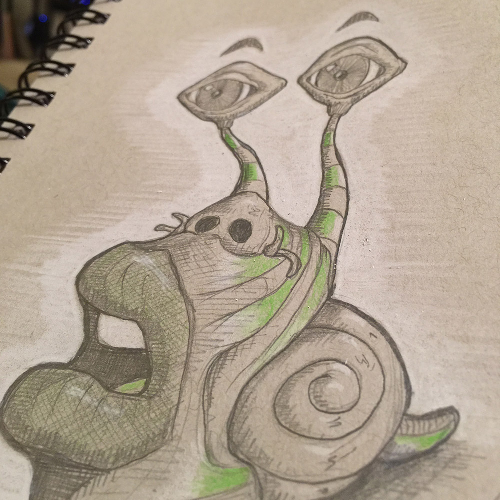 This is Frank. Frank is a snail. Unfortunately there is no sense of scale to this drawing or you would realize that Frank could eat a Cretinian Hufaloom and three Pigmy Elephants for a mid-day snack and still have room for some crumpets. Sketch-A-Day 187