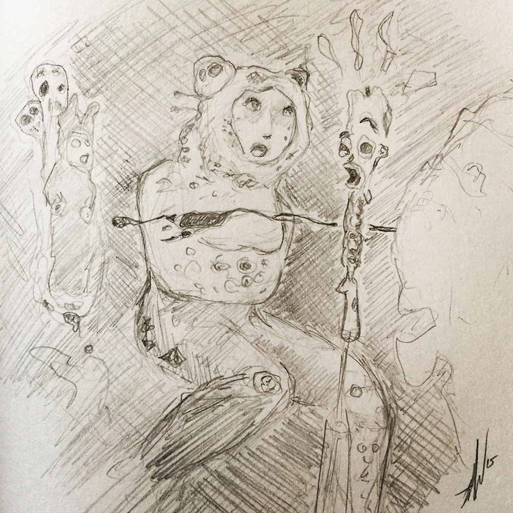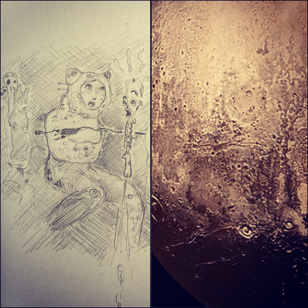 An initial sketch of what I plan to paint. Please tell me I’m not the only one who saw this random scene when the first clear shot of Pluto came back during the approach. Seriously, take a look! First, a supporting side by side image to compare followed by a larger shot of the drawing. Sketch-A-Day 207